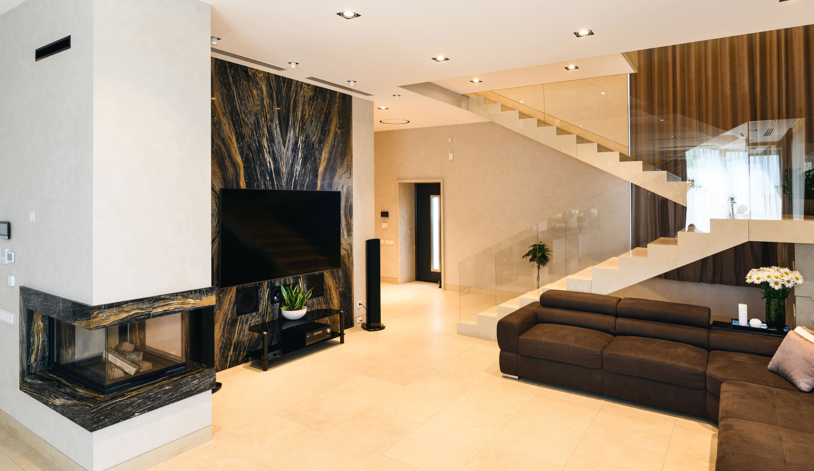 Полы из натурального камня придают интерьеру эксклюзивность, свидетельствуя об изысканном вкусе владельца.